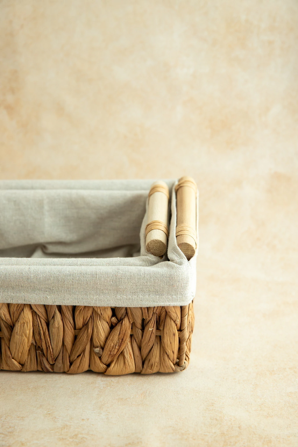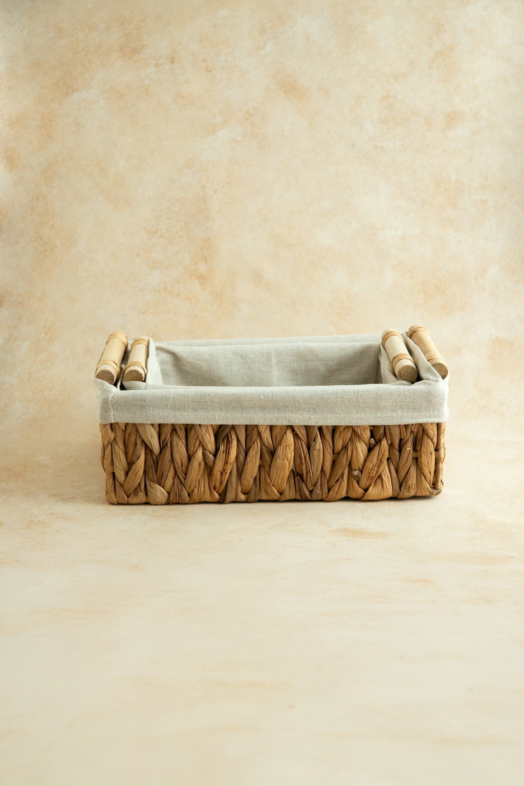 Su estructura tejida a mano le da un encanto rústico, mientras que la funda de tela protege su interior y facilita la limpieza. Ideal para organizar ropa, accesorios, cosméticos o productos de baño.