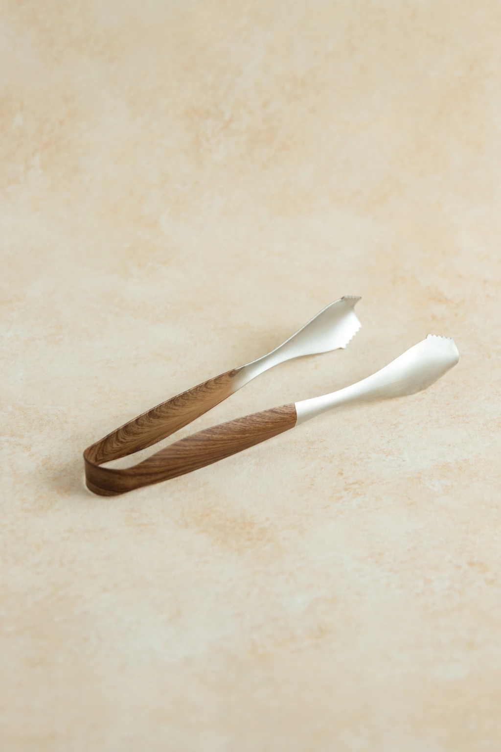 Pinza para hielos fabricada en acero inoxidable, con mango símil madera de acacia que le aporta un estilo cálido y elegante.