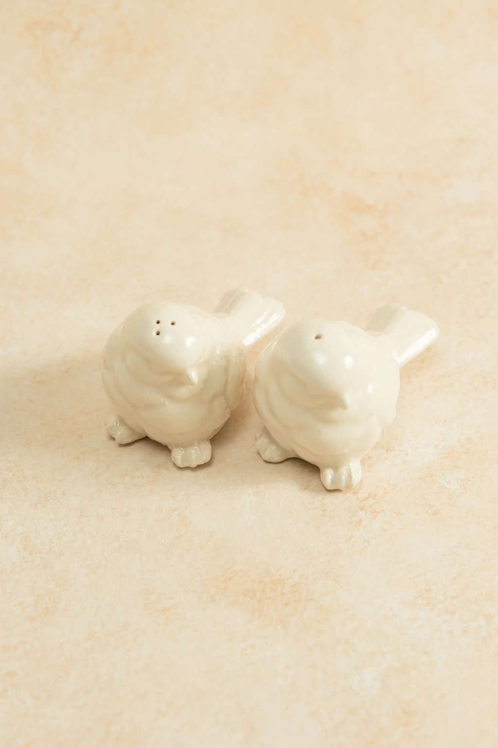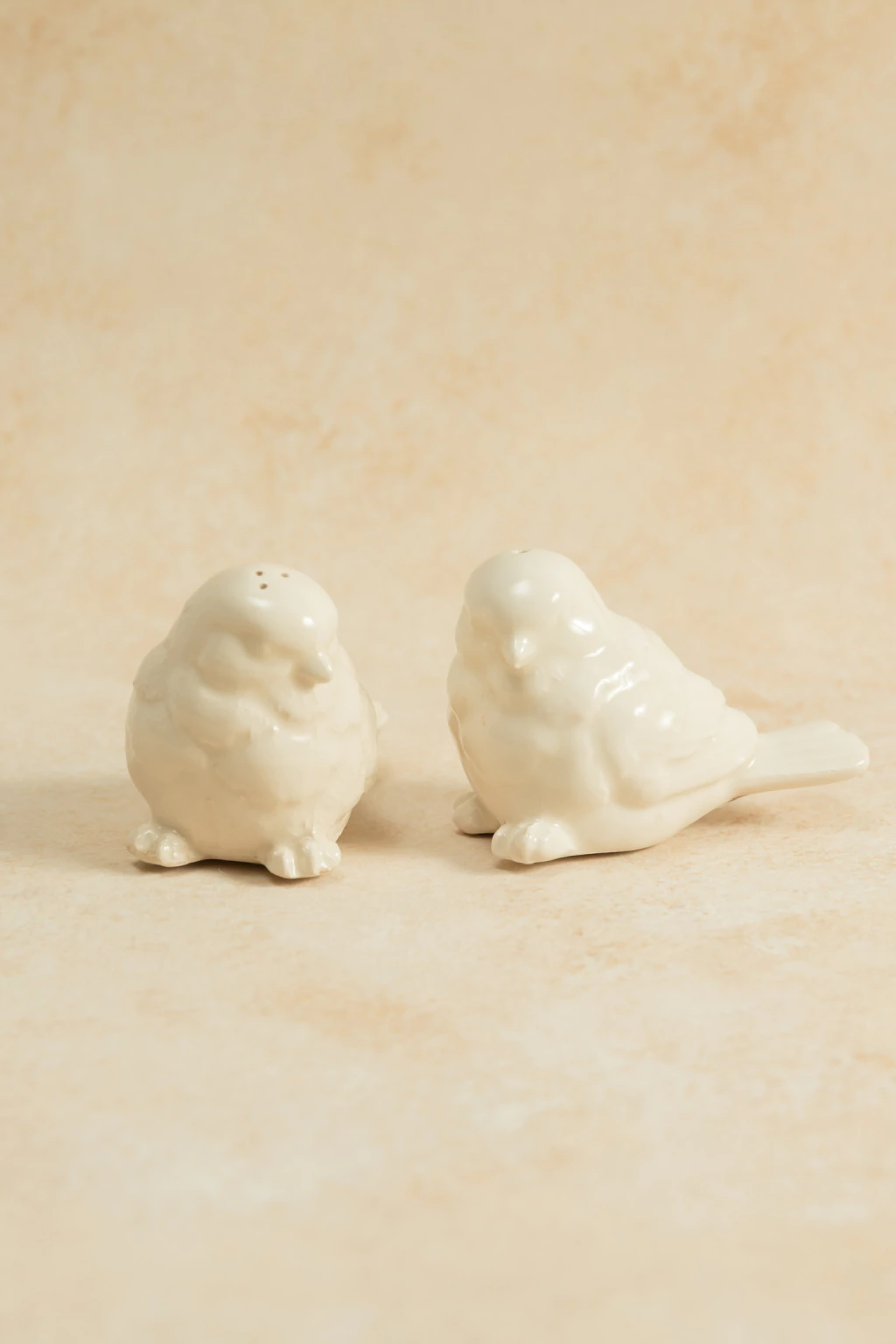 Set de salero y pimentero de cerámica en forma de pajarito.