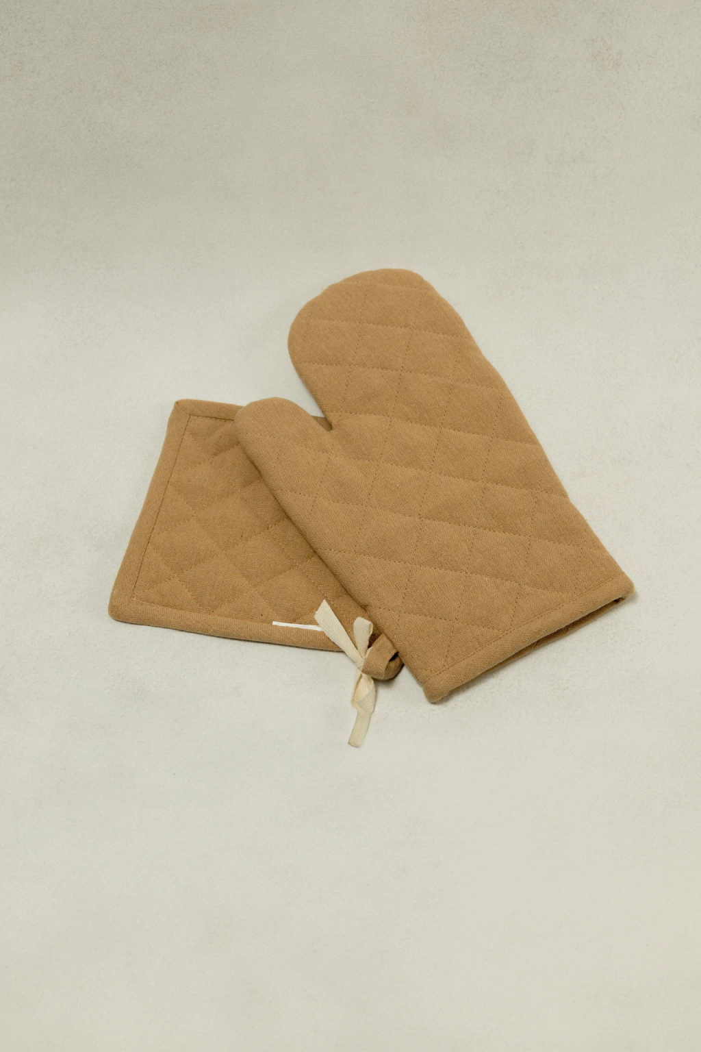 Este set incluye una manopla y una agarradera confeccionadas en tela resistente al calor, perfectas para manipular ollas, fuentes y bandejas con seguridad y estilo.