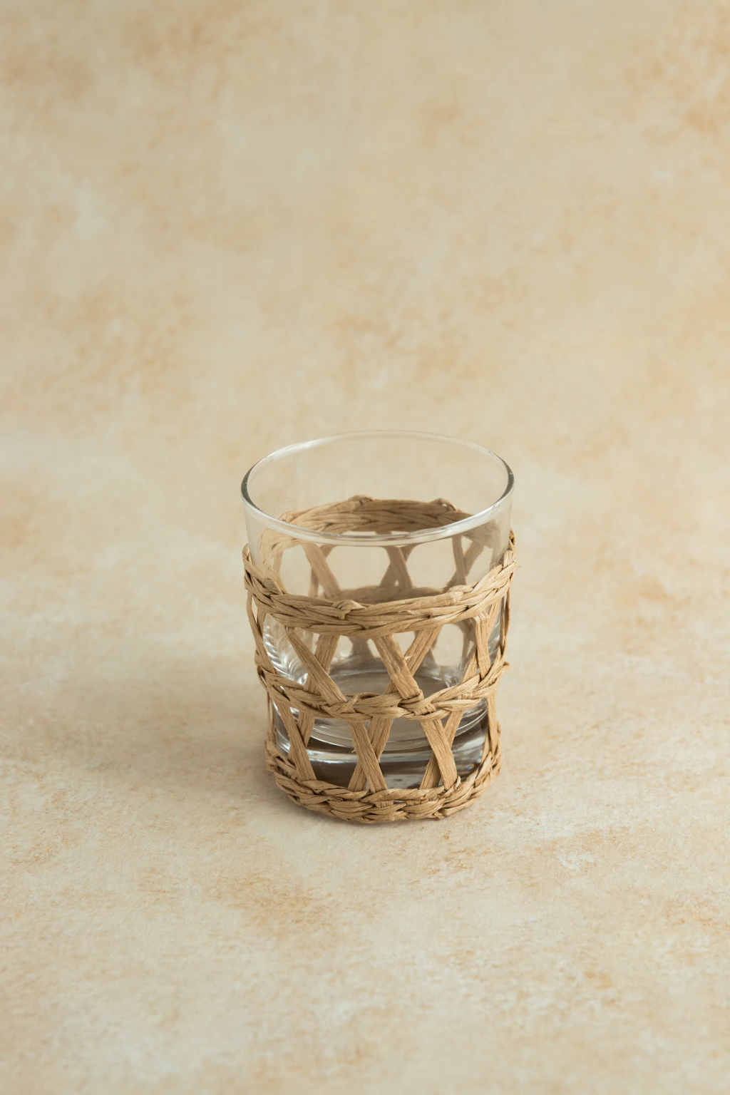 Set de 2 vasos de vidrio con funda tejida en seagrass, un dúo que combina la elegancia del vidrio con la calidez de las fibras naturales.